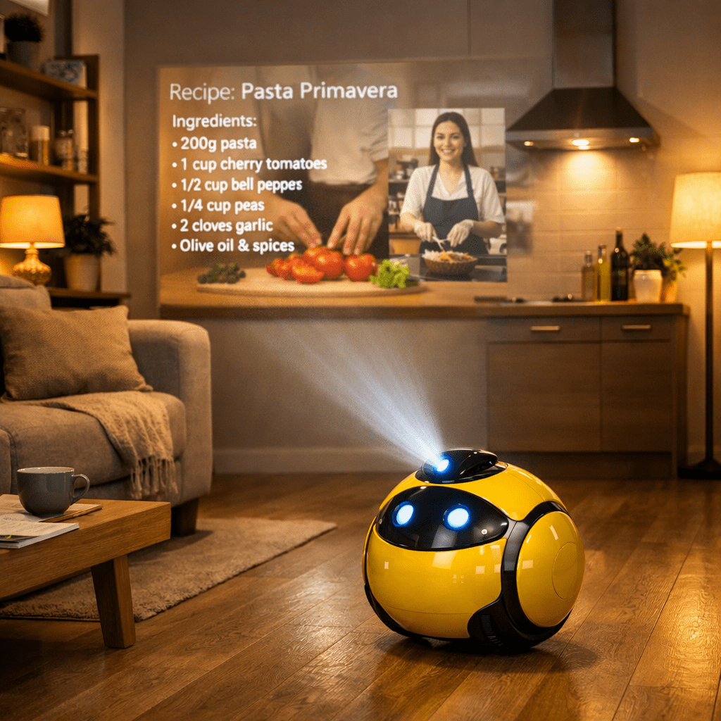 What Can It Do? Imagine a small, yellow, ball-shaped robot that follows you around. It projects movies on your wall, answers phone calls, and even feeds your pets when you are away.